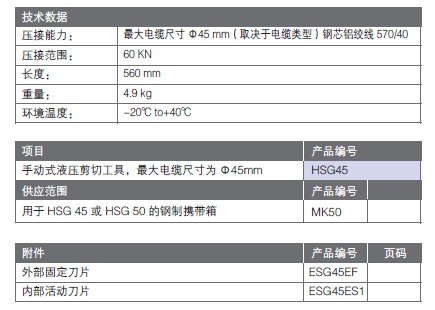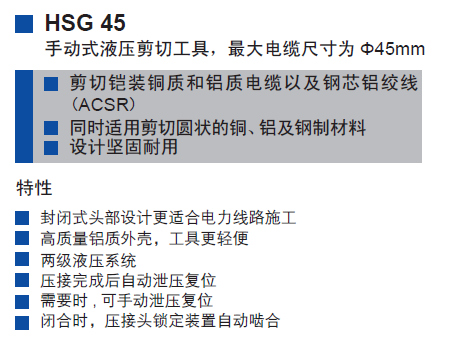 HSG45手動式液壓切刀(德國 Klauke)全自動復(fù)位,兩段式液壓系統(tǒng):切割工作更快、更輕;切割更容易。翻開式頭部設(shè)計; 360度自由旋轉(zhuǎn);手動泄壓按鈕:壓接中途松開,快速復(fù)位。出力:60KN最大切斷范圍 銅/鋁:45mm銅、鋁電纜頭部形式:翻開式長度:540mm