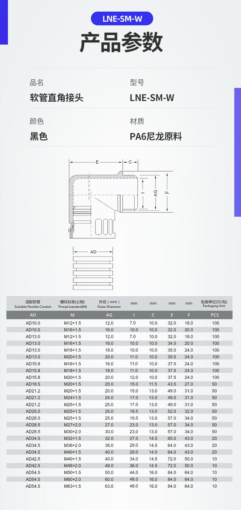 型號 | AD適配軟管外徑尺寸 | 螺紋規(guī)格公制 | 螺紋外徑(mm) | I(mm) | C(mm) | E(mm) | F(mm) |