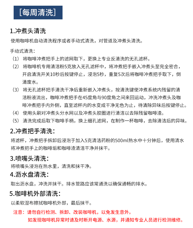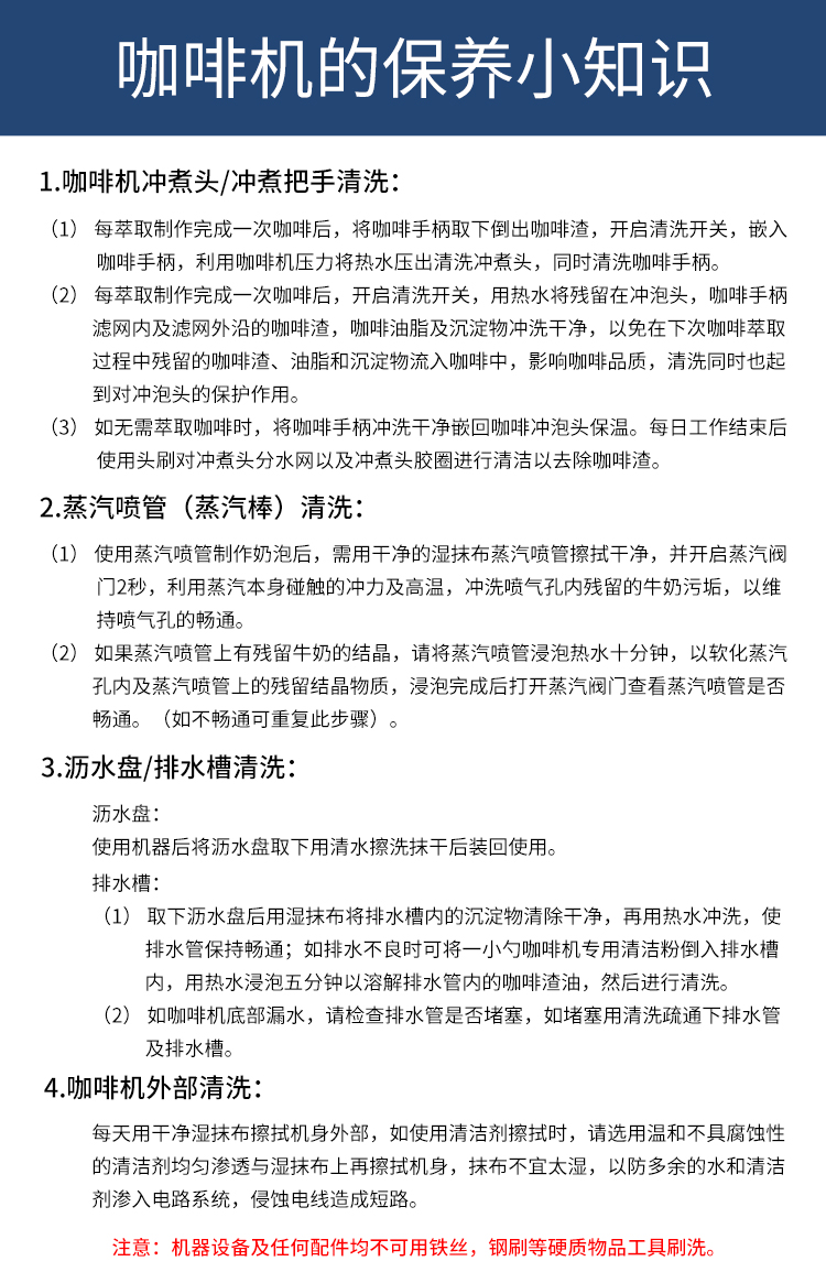 開機前用濕抹布擦拭清潔機身。每天制作完咖啡后將手柄取下并按咖啡機的清洗鍵,將殘留在沖煮頭內及濾網上的咖啡渣沖凈,再將手柄嵌入接座按清洗鍵左右晃動手柄將沖煮頭內側的咖啡渣沖洗掉。再開一次蒸汽,以清潔蒸汽管內的牛奶殘留,完后用干凈濕抹布擦拭蒸汽管外部(若外部有牛奶垢,則用熱水浸泡蒸汽管再重復以上操作)。每日要取下盛水盤用清水沖洗干凈,抹布擦干后按裝上。后將手柄用熱水浸泡,溶解出殘留在手柄上的咖啡油。