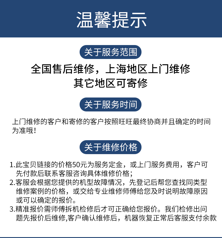服務快捷:全天24小時為您服務、讓客戶足不出戶、就能享受全方面服務。果故障無法解決,請勿自行拆機,致電專業(yè)售后維修,上海市內,為您排憂解難!