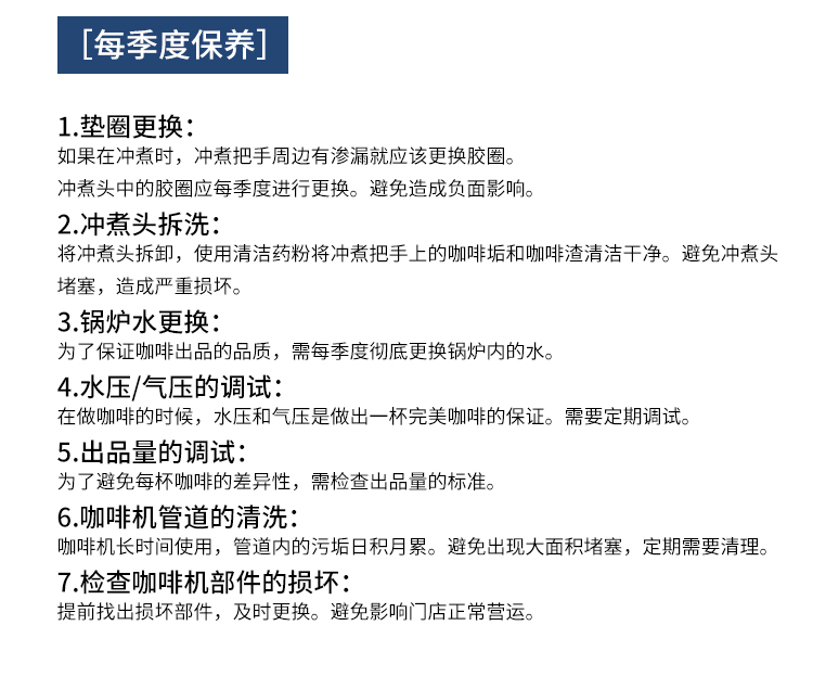 每一年到兩年的大保養(yǎng)問題:長時間使用后,咖啡機鍋爐,管道難免會有水垢,這是就需要拆機大保養(yǎng)了(此操作需要維修人員完成)。