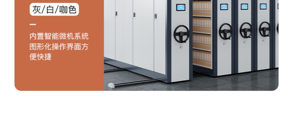 密集架,又稱密集柜,密集型檔案的一種,是在復(fù)柱式雙面固定架的底座上安裝軸輪,能沿地面鋪設(shè)的小導(dǎo)軌直線移動(dòng)的架子,可根據(jù)需要將多個(gè)架子靠攏或分開