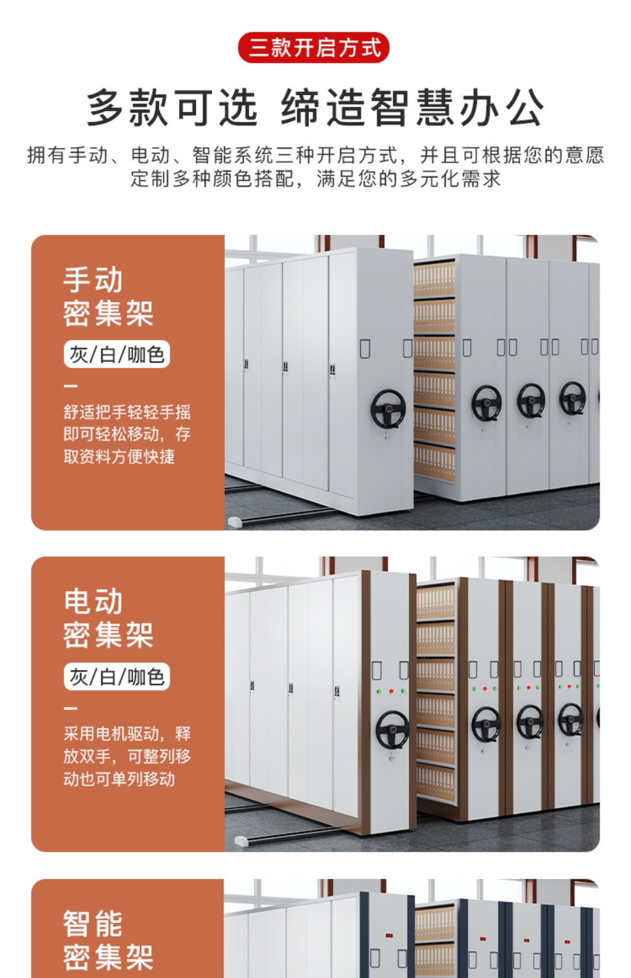 密集架分類:按操作不同分為:手動(dòng)式密集架,電動(dòng)式密集架,電子智能密集架。