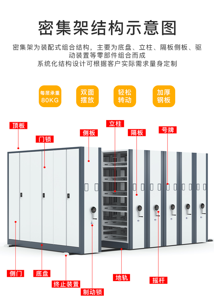 主要分類:按結(jié)構(gòu)不同分為:開放式密集架,半封閉式密集架,全封閉式密集架